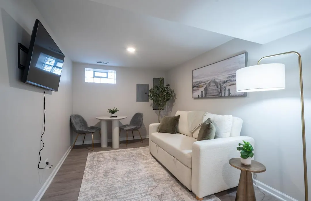 A Charming Modern Chic Basement Apartment includes a seating area with climate control for utmost comfort. This apartment is equipped with a bathroom that features hairdryers and towels. You'll also come across a separate toilet and a shower.